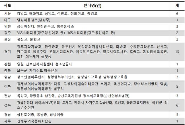 대구, 강원, 충북, 제주 등은 1곳씩 포함됐다. 이번에 선정된 센터에는 학교복합시설이나 도서관, 청소년센터 등 다양한 형태의 공간이 활용된다.