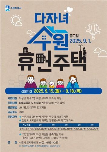 수원시(시장 이재준)가 9월 15일부터 18일까지 '다자녀 수원휴먼주택' 입주자'를 모집한다.