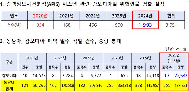 관세청의 ‘승객정보 사전분석시스템(APIS)’은 입국 전 전과 및 수배 정보를 바탕으로 위험 인물을 식별하는 제도다. 그러나 해외 당국의 정보 제공이 제한적이어서 실제로는 대부분 한국인만이 사전 식별 대상에 포함되는 한계가 드러났다. 캄보디아발 APIS 대상 인원은 2023년 990명에서 올해 1,993명으로 두 배 가까이 늘었다.