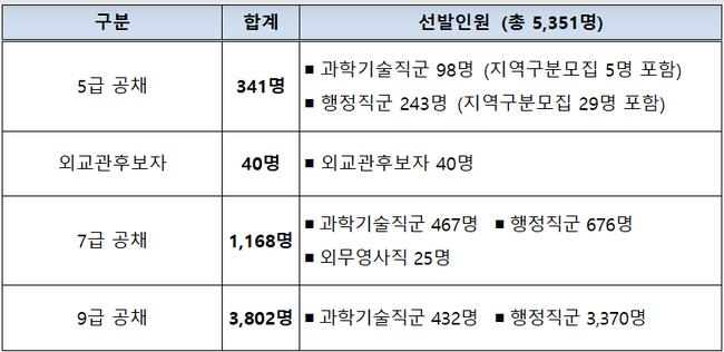 세부적으로 5급은 과학기술직군 98명과 행정직군 243명으로 구성되며, 7급은 과학기술직군 467명, 행정직군 676명, 외무영사직 25명이다. 9급은 과학기술직군 432명과 행정직군 3,370명을 선발한다.