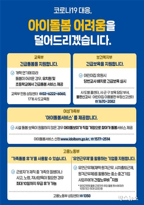 4개 부처가 휴원 또는 개학 연기에 따른 돌봄 공백에 대한 학부모의 우려와 걱정을 해소하고자 적극 협의해, 코로나19 확산 방지를 위해 온국민이 힘을 모으는 이때, 즉시 시행 가능한 방안을 중심으로 범부처가 협력해 추진하기로 했다.