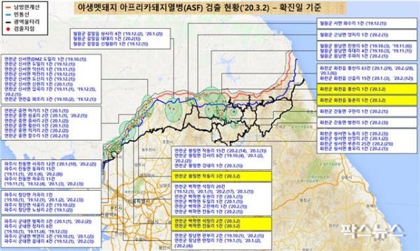 이로써 화천군 115건, 연천군 93건, 파주시 68건, 철원군 22건, 총 298건의 멧돼지 아프리카돼지열병이 확진됐다.