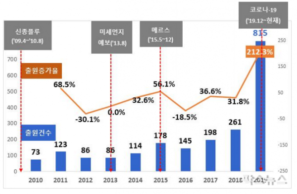 연도별 디자인출원 건수 및 전년대비 출원증가율 이는 최근 전 세계인의 건강을 위협하는 코로나 19와 같은 호흡기 질환과 미세먼지의 유해성 인식이 확대되고 특히 최근 갈수록 진화되고 있는 교통수단의 발달 등으로 전 세계가 지역화 됨에 따라 마스크 수출 등 관련 산업의 성장세로 인해 디자인 출원도 활성화 되고 있는 것으로 보인다.