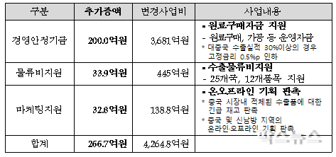 농식품부는 단기적인 당면 애로를 해소하고 농식품 수출 동력을 조기에 회복하고자, 지난 3월 2일 경영 안정화를 위한 자금 200억원, 물류비 지원 33.9억원, 온·오프라인 긴급 판촉 지원 32.8억원 등 총 266.7억원을 추가 확보하고 조속히 진행할 계획이라고 전했다.