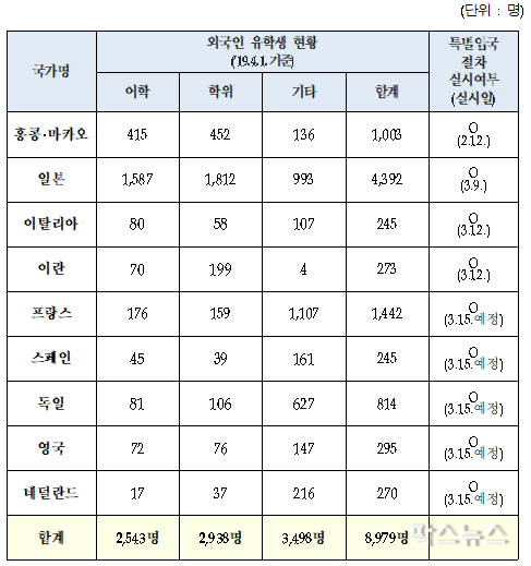 교육부는 중국 유학생에게 적용하였던 보호·관리 방안을 특별입국절차를 적용하는 국가로 확대하기로 했다.