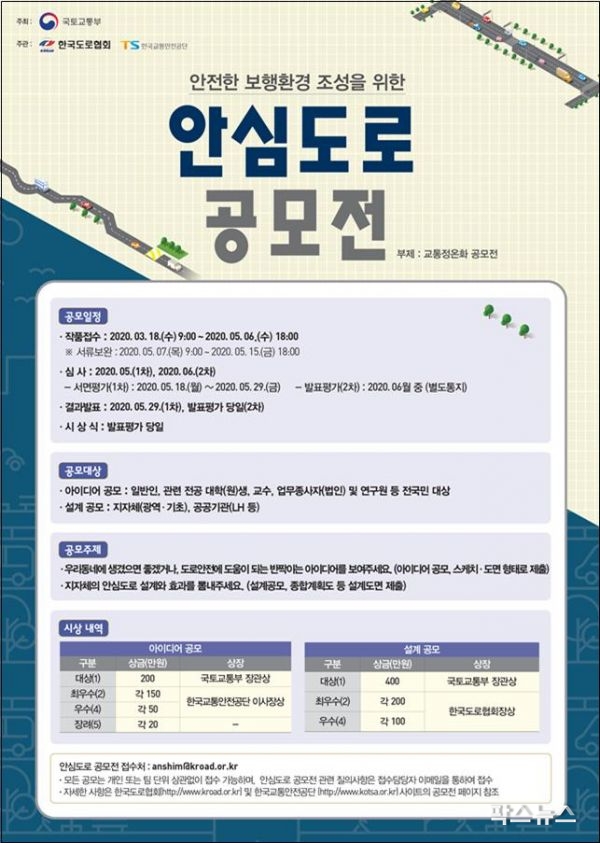 이에 따라 국토부는 보행자 사고의 감소에 효과적인 안심도로 시설의 적극적 확산을 위해 관련 지침을 마련하고 안심도로 시설의 시범설치 등을 통해 실효성을 검증해 왔으며 이번 공모전을 통해 시설 설치·적용 방안 등을 적극 홍보해 안심도로 전국 확대의 물꼬를 튼다는 계획이라고 전했다.