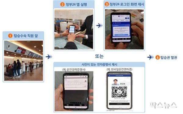신분증을 미소지한 국내선 항공기 승객은 탑승권 발권 및 검색장 진입 시 탑승수속 직원 및 보안요원에게 승객 본인 스마트폰으로 정부24 앱을 실행한 후 로그인하는 절차를 보여주면 된다.