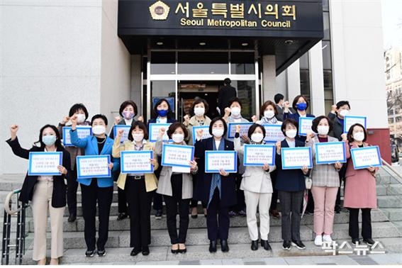 촉구결의 구호를 외치를 서울시의회 여성의원들 첫째줄 왼쪽에서 5번째(중앙)에 위치한 김혜련 의원