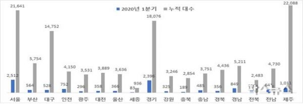 누적실적 기준으로는 제주도 1위, 서울시 2위, 경기도 3위 순으로 나타났다.
