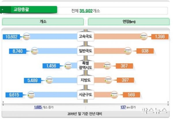 국토교통부는 고속국도, 일반국도, 지방도 등 도로법에 따른 전국 도로상의 교량 및 터널에 대한 기초현황과 통계자료를 수록한 “2019년도 도로 교량 및 터널 현황조서”를 발표했다.