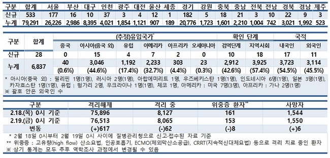19일 코로나19 국내 발생 확진자 현황, 해외유입 확진자 현황, 확진자 관리 현황 (자료=질병관리청)