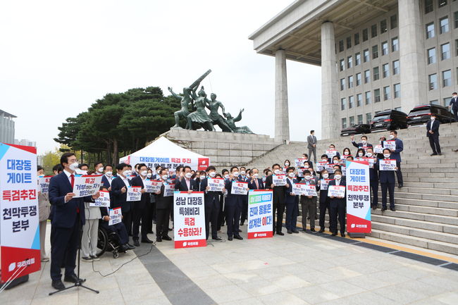 국민의힘은 이날 오전 9시에 이준석 대표와 김기현 원내대표 등 지도부와 김은혜 의원 등 대장동 게이트 TF 멤버 등 의원 50여명이 참석한 가운데 출정식을 열었다.