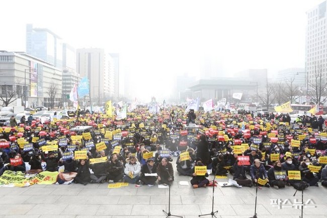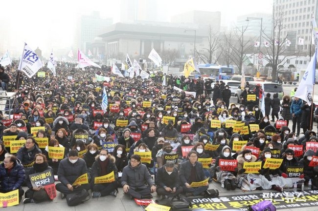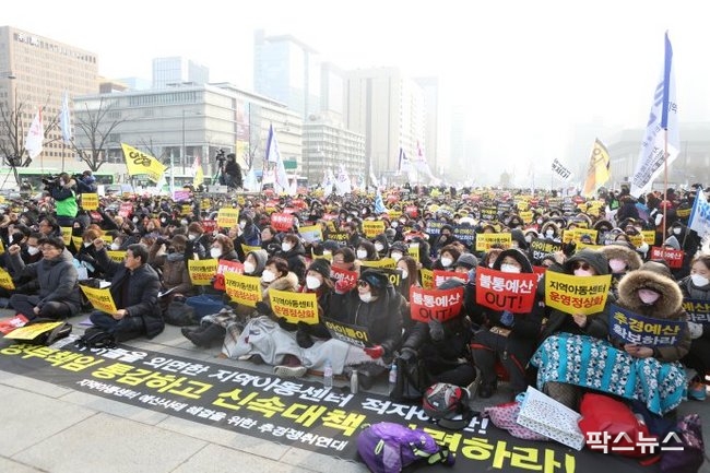 지역아동센터 예산사태 해결을 위한 추경쟁취연대는 최악의 미세먼지가 덮친 15일 오후 광화문 광장에서 6000여명의 지역아동센터 관계자 및 지지자들이 참가한 가운데 ‘지역아동센터 예산사태 해결을 위한 추경쟁취 궐기대회’를 열고 있다. 2019.1.15. 최인호 기자 이번 광화문 집회에는 ‘사회복지시설 종사자 단일임금 체계 연대’에서 사회복지계 종사자 처우개선 활동을 펼치고 있는 한국사회복지사협회 오승환 회장을 비롯하여 여러 사회복지계 인사들이 참여, 조속한 해결을 기원하는 지지와 성명을 발표했다.