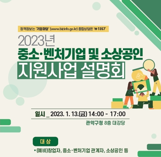 관악구가 서울지방중소벤처기업청(이하 ‘서울지방중기청’)과 공동 주관으로 ‘2023년 중소‧벤처기업 및 소상공인 지원사업 설명회’를 오는 13일 오후 2시 관악구청 대강당에서 개최한다고 밝혔다.