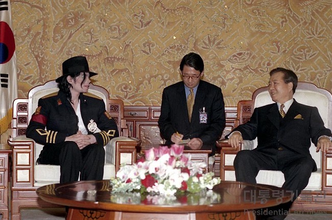 75세 김대중이 마이클 잭슨과 한류의 미래를 그려나갔다면, 75세 김문수는 국민의힘 중앙당사에서 다리 찟기를 하며 극우 유튜브들에게나 영합하고 있다. 사진은 김대중 전 대통령이 재임 시절 마이클 잭슨과 함께 이야기를 나누는 모습. (사진 출처 : 행정안전부 대통령 기록관 홈페이지)
