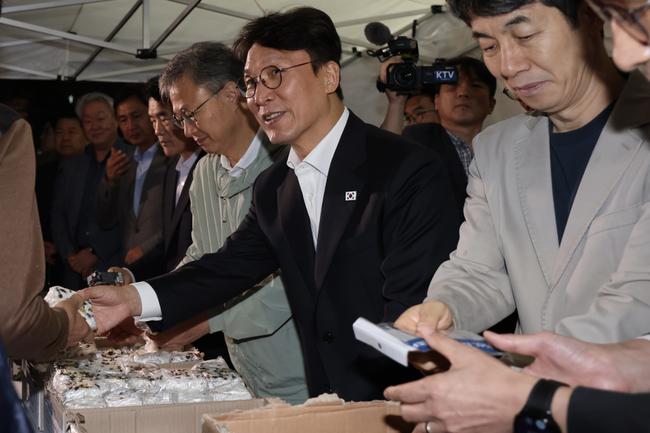 김민석 국무총리가 10일 구로구 남구로 새벽인력시장을 찾아 '종합지원 이동 상담버스'를 둘러보고 근로자들에게 떡을 나눠주고 있다.