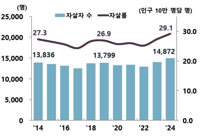 2024년 우리나라 자살률이 인구 10만 명당 29.1명으로 집계돼 2011년 이후 가장 높은 수준을 기록했다. 연간 자살자 수는 1만4,872명으로 전년 대비 894명(6.4%) 늘었으며, 하루 평균 40.6명이 스스로 목숨을 끊은 셈이다.