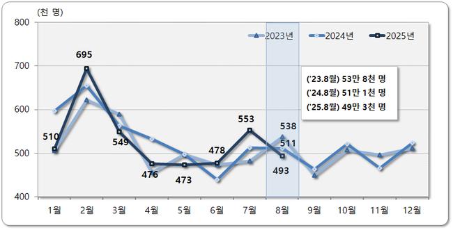 2025년 8월 한 달 동안 국내에서 주소지를 옮긴 인구는 49만 3천 명으로 집계됐다. 이는 2024년 같은 달 51만 1천 명보다 3.5% 줄어든 수치이며, 2023년 8월 53만 8천 명과 비교하면 2년 연속 감소세다.