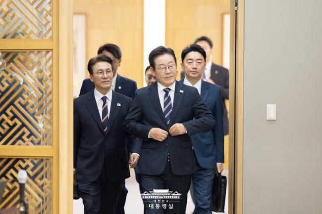 이재명 대통령의 직무 수행 지지율이 56%로 하락하며 취임 후 최저치를 기록했다.이재명 대통령이 23일 한남동 관저에서 더불어민주당 원내지도부와 만찬을 하고 있다. 한국갤럽이 19일부터 21일까지 전국 만 18세 이상 1,004명을 대상으로 실시한 여론조사에 따르면, 이재명 대통령의 직무 수행을 '잘하고 있다'고 응답한 비율은 56%로 집계됐다.&
