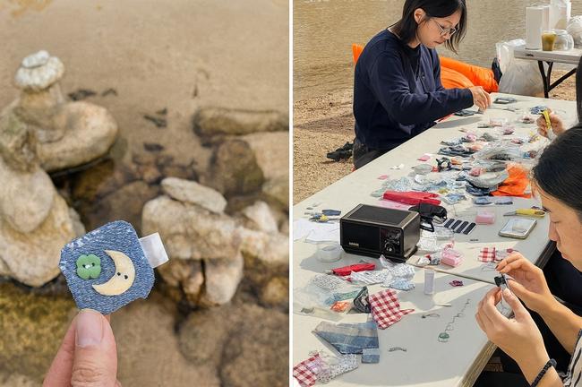 <2025 돌탑제> 현장. 참가자들이 돌탑을 쌓고, 천조각을 실로 엮어 브로치를 만드는 모습. 서로 다른 색과 무늬가 하나로 이어지며 ‘우리’의 의미를 더했다.