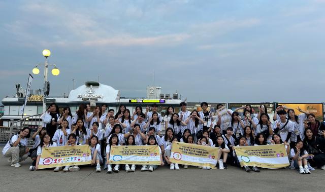 불꽃크루즈 체험 전, 한강 유람선 선착장에서. 청소년들이 야경을 배경으로 단체 사진을 촬영하며 역사문화교류캠프의 추억을 기록하고 있다