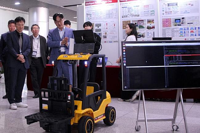 24일 진행한 ‘Future 2030 서밋’에서 LG전자의 P5G 통신 기술을 활용해 스마트팩토리에서 활용하는 무인 지게차 로봇 제어 시연을 진행하고 있다. 행사장에서는 LG전자의 ▲6G 전이동통신(FDR·Full Duplex Radio) 솔루션 ▲P5G 통신 기반 스마트팩토리 무인 지게차 로봇 제어 ▲비지상통신망(NTN)을 활용한 차세대 음성통신 솔루션 등이 시연돼 큰 관심을 끌었다. KAIST와 KRISS는 AI 반도체 기반 로봇, 6G 전파 측정 시스템, 양자 컴퓨팅 소재 SW 솔루션 등 다양한 연구성과를 전시했다.