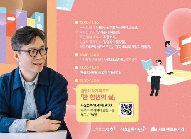 이번 행사의 하이라이트는 대한민국 대표 스토리텔러인 김영하 작가와의 만남이다. 2025년에 발표한 산문집 '단 하나의 삶'을 주제로 북토크를 진행해, 참여자들에게 인생과 독서에 대한 깊이 있는 통찰과 영감을 선사하며 다양한 이야기를 나눌 예정이다.