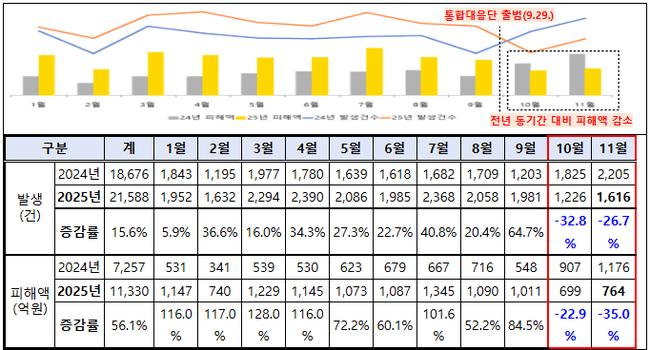 경찰청에 따르면 지난 9월 29일 통합대응단 출범 전까지 올해 보이스피싱 발생 건수와 피해액은 전년 대비 각각 28.0%, 90.7% 증가하며 급증세를 보였다. 그러나 출범 이후인 10~11월의 전년 동기간 통계에서는 뚜렷한 감소세가 나타났다. 10월 발생 건수는 32.8%, 피해액은 22.9% 줄었고, 11월에는 발생 건수 26.7%, 피해액 35.0% 감소가 확인됐다. 추석 연휴가 포함된 10월의 계절적 요인을 제외하더라도 11월의 감소가 이어지면서 대응 전략의 효과가 본격화됐다는 평가가 나온다.