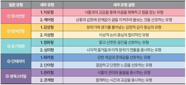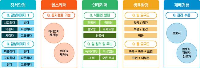 질문 문항은 반려식물로부터 기대하는 기능과 개인 성향을 두 축으로 구성됐다. 정서 안정, 공기정화, 실내장식 등 식물에 기대하는 역할과 함께 생육 환경, 재배 경험 등 생활 여건을 종합적으로 묻는다. 이를 통해 관리 부담을 줄이면서도 만족도를 높일 수 있도록 설계했다.