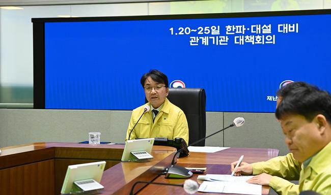 김광용 행정안전부 재난안전관리본부장이 19일 정부서울청사 상황실에서 ‘1.20~25일 한파·대설 대비 관계기관 대책회의’를 주재하며, 기관별 대비 상황을 점검하고 있다.